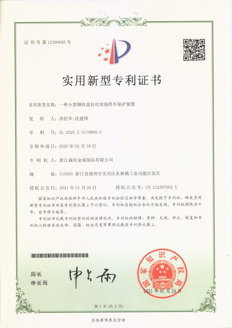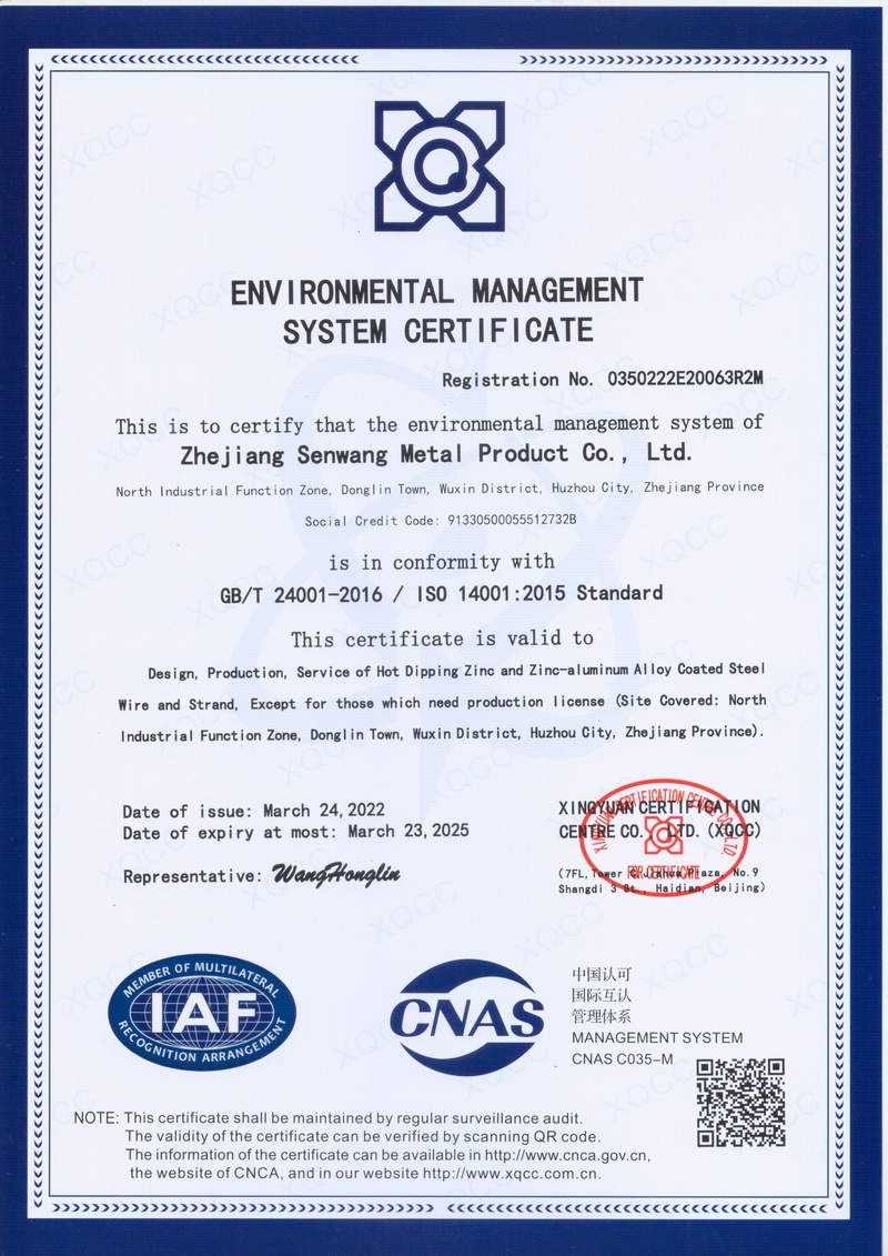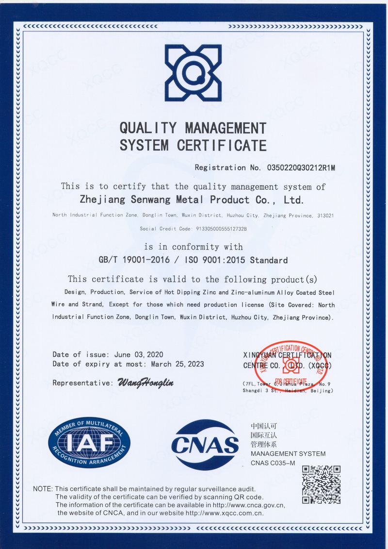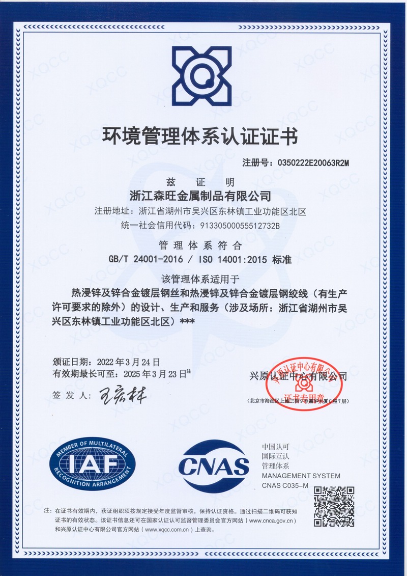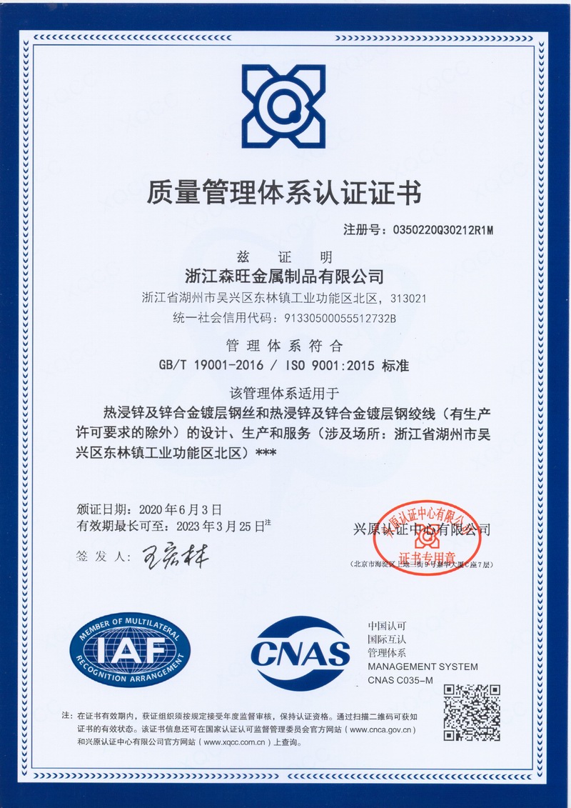 浙江森旺金屬制品有限公司成立于2012年,坐落湖州市吳興區(qū)東林鎮(zhèn)工業(yè)功能區(qū)。公司專業(yè)從事各類鍍鋅鋼絲、鋼絞線等產(chǎn)品的開發(fā)及生產(chǎn)。目前產(chǎn)品已廣泛應(yīng)用于各類通信光電纜,電力輸送,電氣化鐵路工程,各類堤壩防護(hù)及農(nóng)業(yè)溫室等工程領(lǐng)域。公司秉承“追求卓越品質(zhì),創(chuàng)建卓著信譽(yù)”的經(jīng)營理念,始終堅持專業(yè)化、規(guī)模化的經(jīng)營模式。